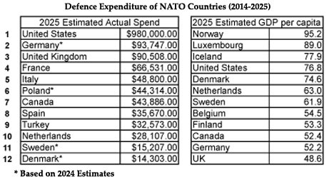 How a man who seemingly is unable to tell the difference between Offensive and Defensive got elected President of the USA is a mystery. When the US was attacked President Bush asked for help and NATO responded. The USA has not been attacked. Certainly it is true that NATO partners, the UK included, do not spend enough on defence. Despite always hitting the NATO target our expenditure is nowhere near where it should be. As the table below shows there are different ways of presenting figures. In cash terms the UK is the third-biggest contributor. In GDP per Capita the Luxembourg police force beats everyone except Norway.